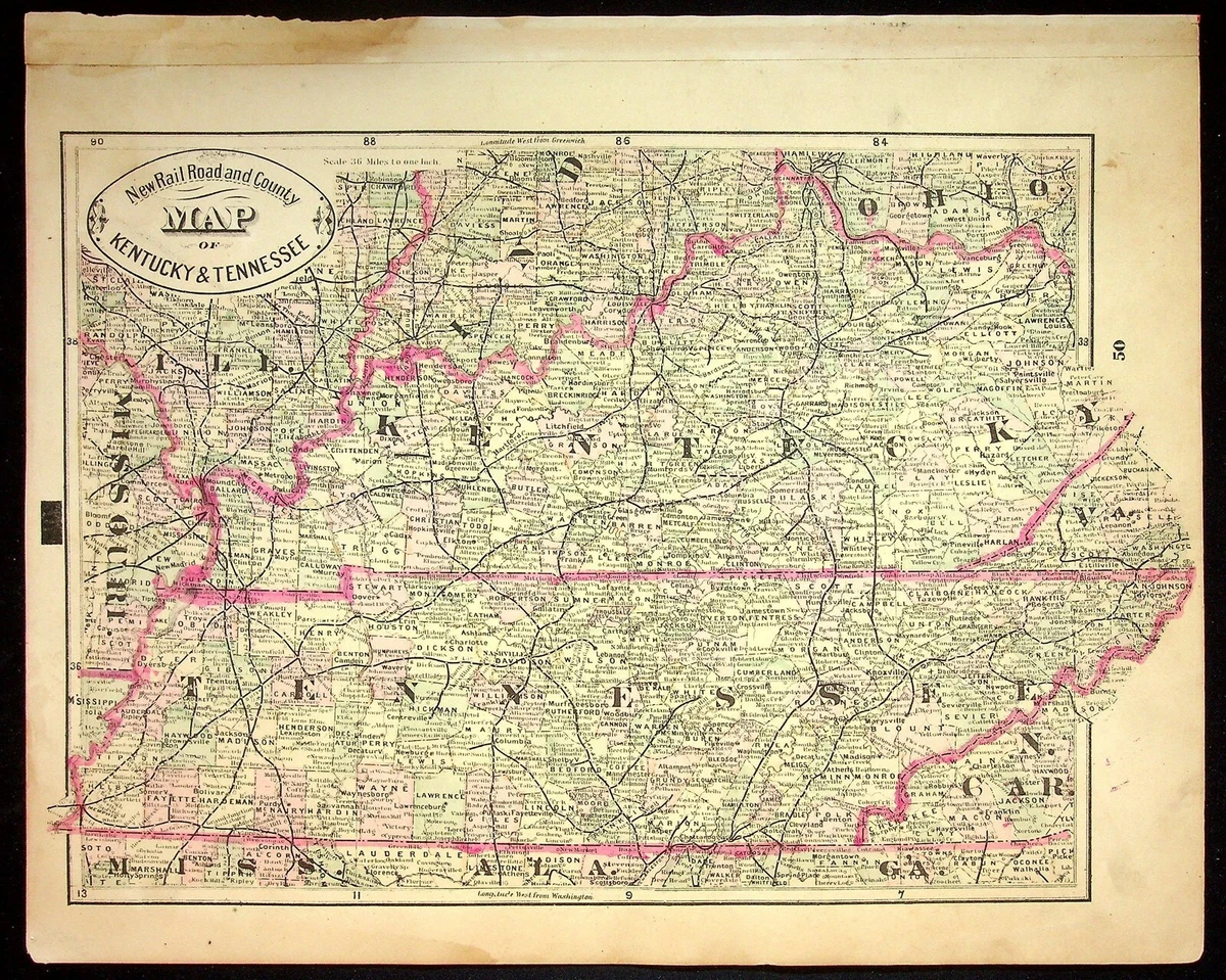 New Railroad And County Map Of Kentucky & TN + Southern TX Hand