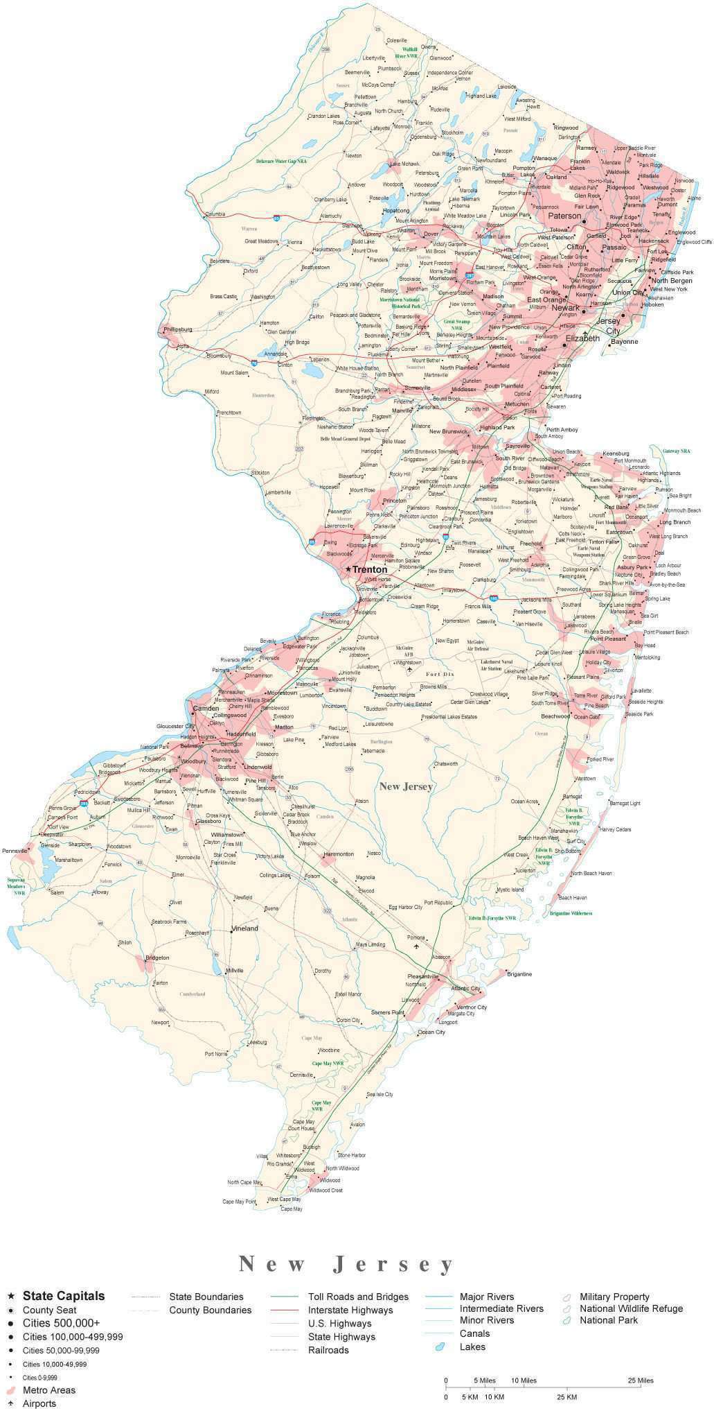New Jersey Digital Vector Map with Counties, Major Cities, Roads